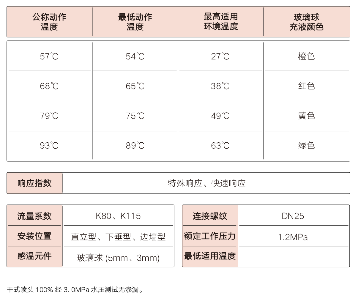 干式喷头适用于有冰冻危险或环境温度有可能超过70℃,使管道内充水汽化升压的干式系统和预作用系统;也可适用于湿式系统。与普通洒水喷头类似,干式喷头用于探测火情,并通过自动喷水来控制和扑灭火情。